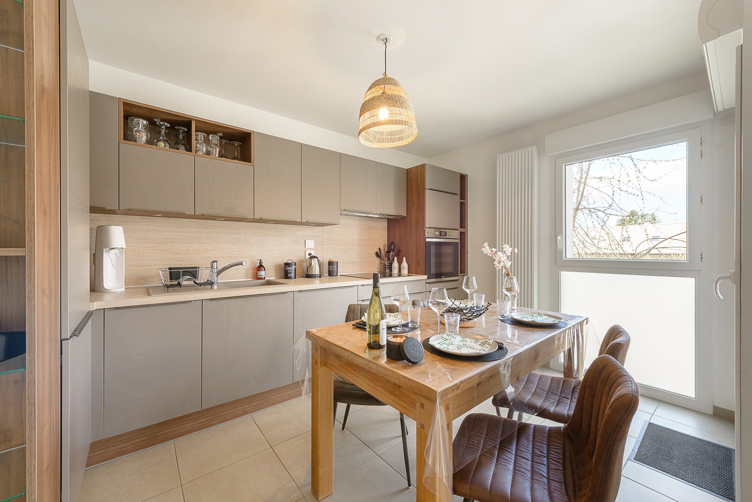 - A modern open-plan kitchen, fully equipped (oven, microwave, extractor hood, crockery, coffee machine, kettle, toaster…)