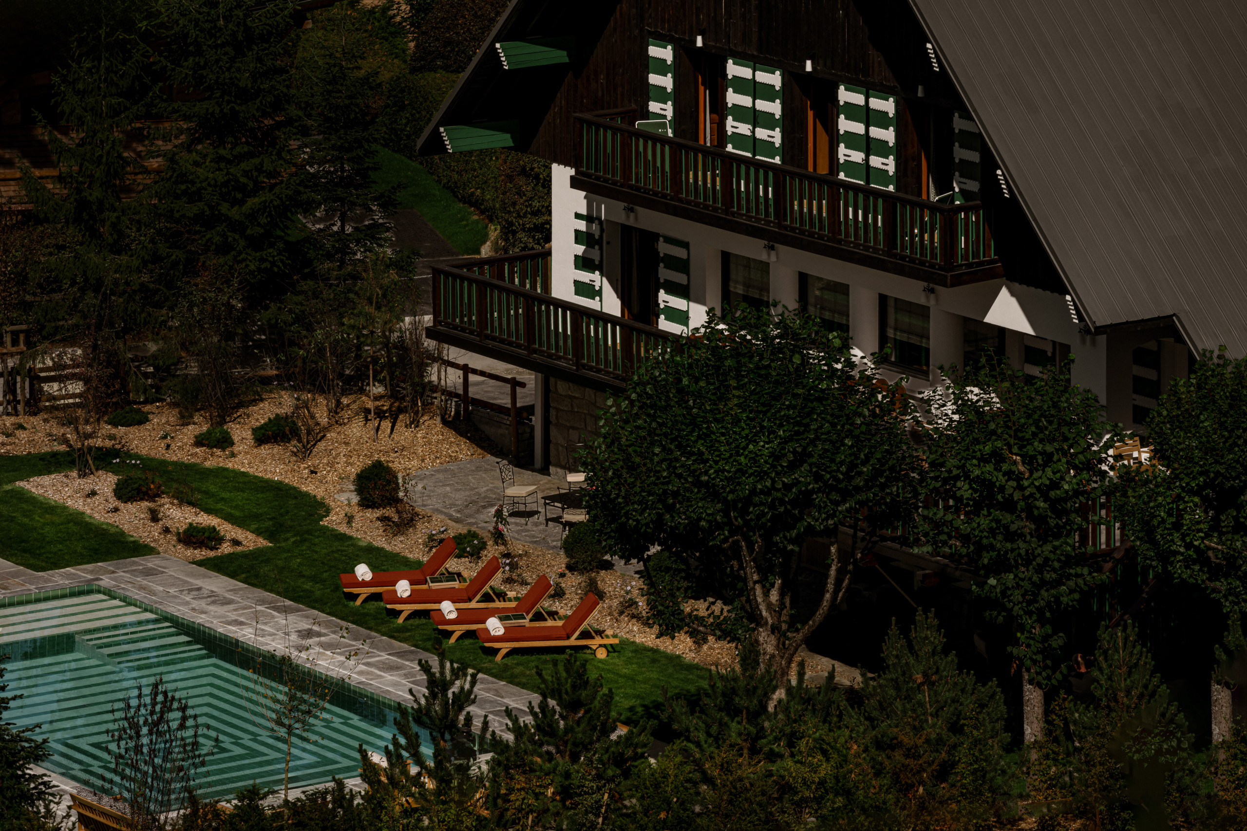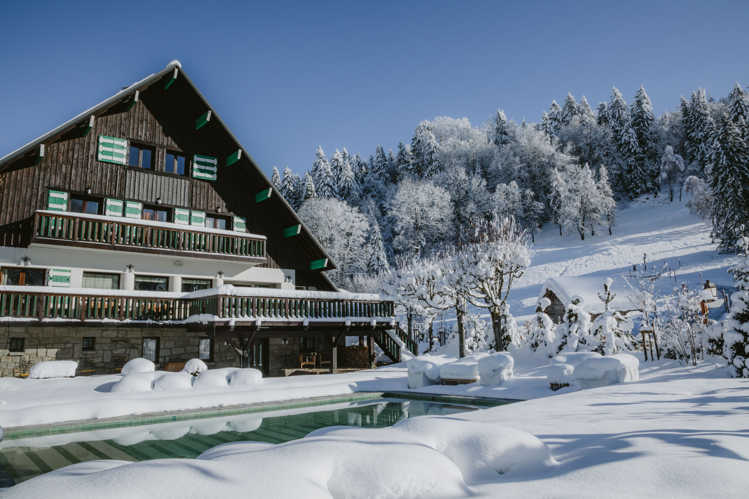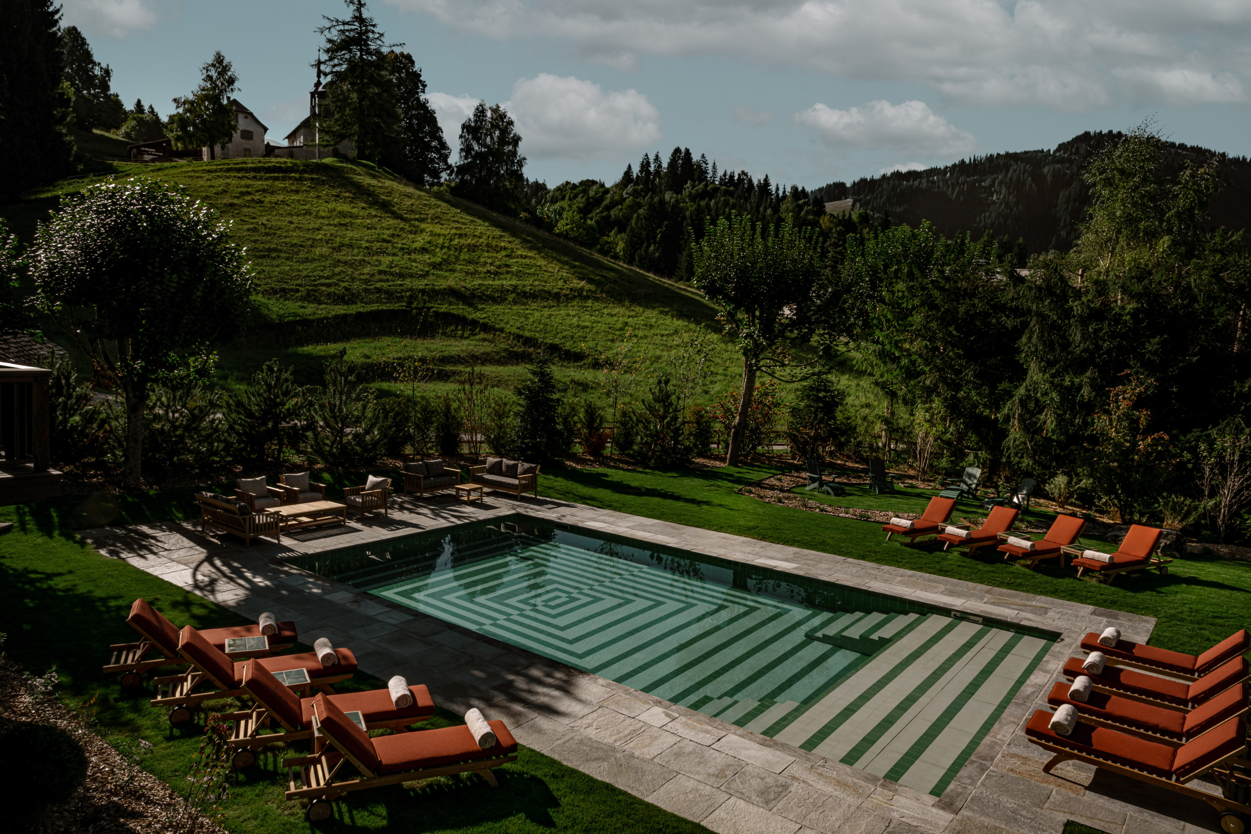 Heated outdoor swimming pool surrounded by furnished terraces and sun loungers, offering open views over the surrounding nature. A privileged setting to relax and fully enjoy the calm and the mountain art of living.