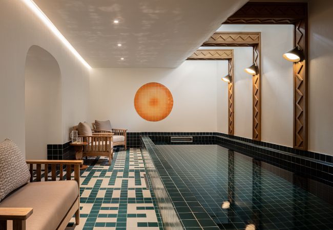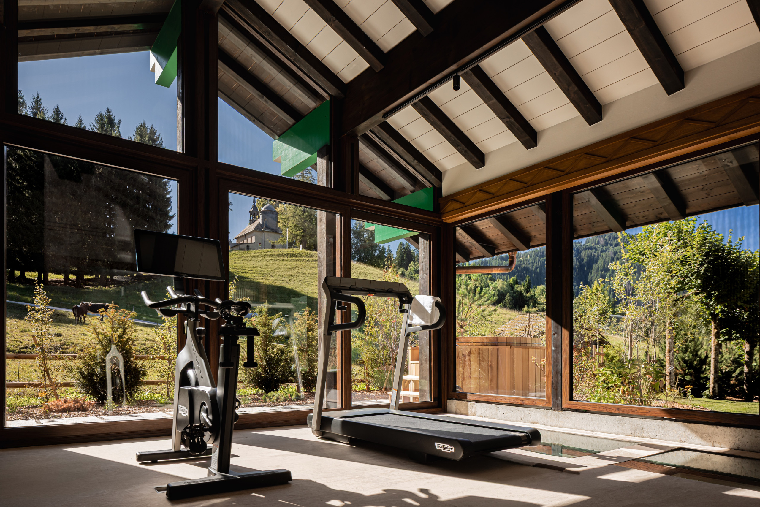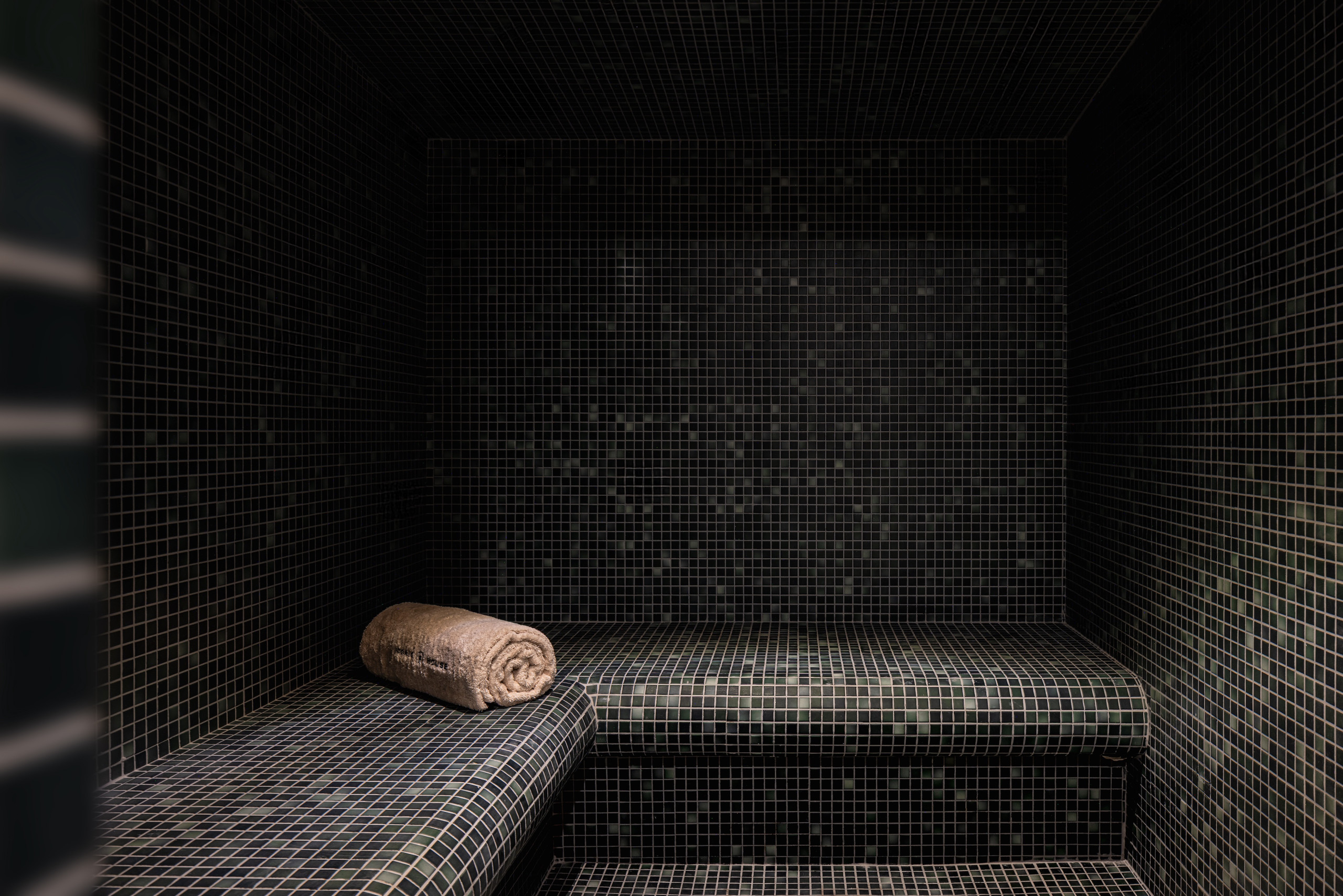 The wellness area features an indoor heated swimming pool, an outdoor heated swimming pool, a sauna, a hammam, an outdoor Nordic bath, and a fully equipped fitness and yoga studio.