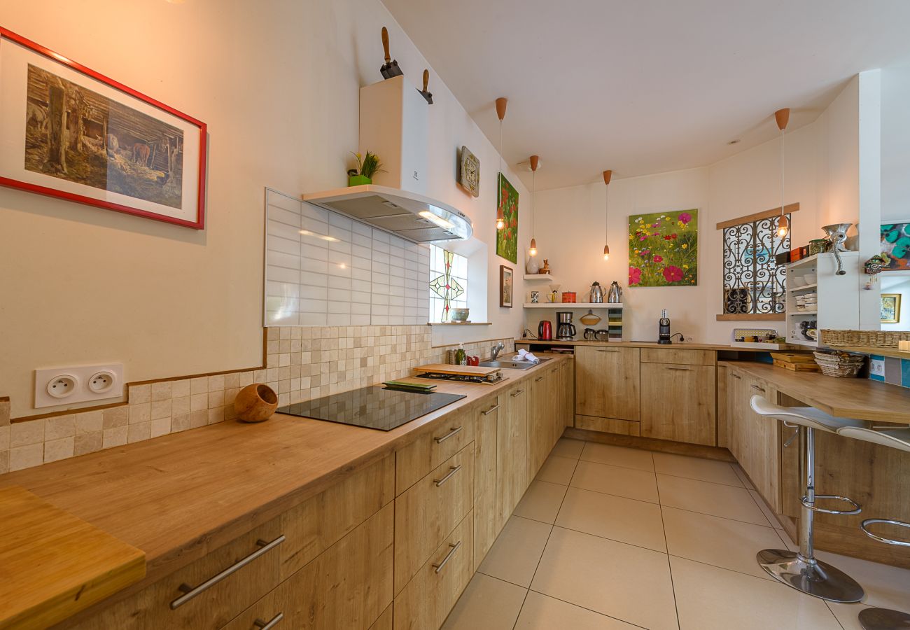 - A spacious independent kitchen fully equipped with central kitchen furniture (induction cooker, oven, microwaves, Nespresso coffee machine, filter coffee machine, dishes, glassware...) and direct access to the garden