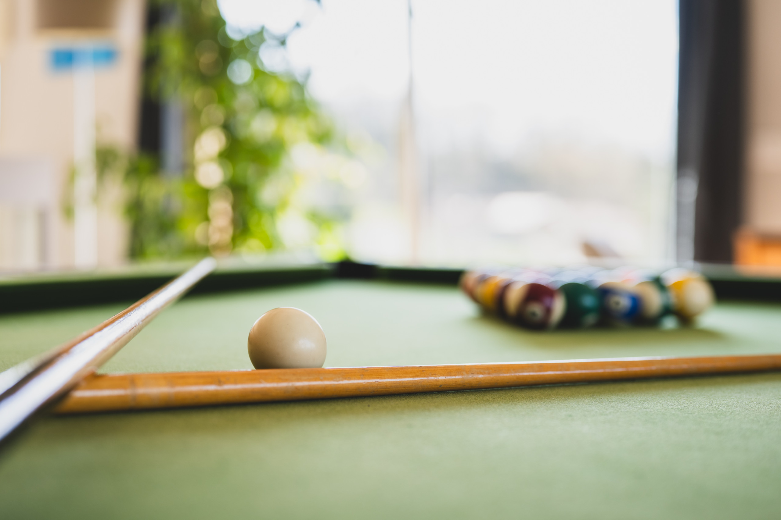 * Lounge area with TV, billiard table, and panoramic mountain views