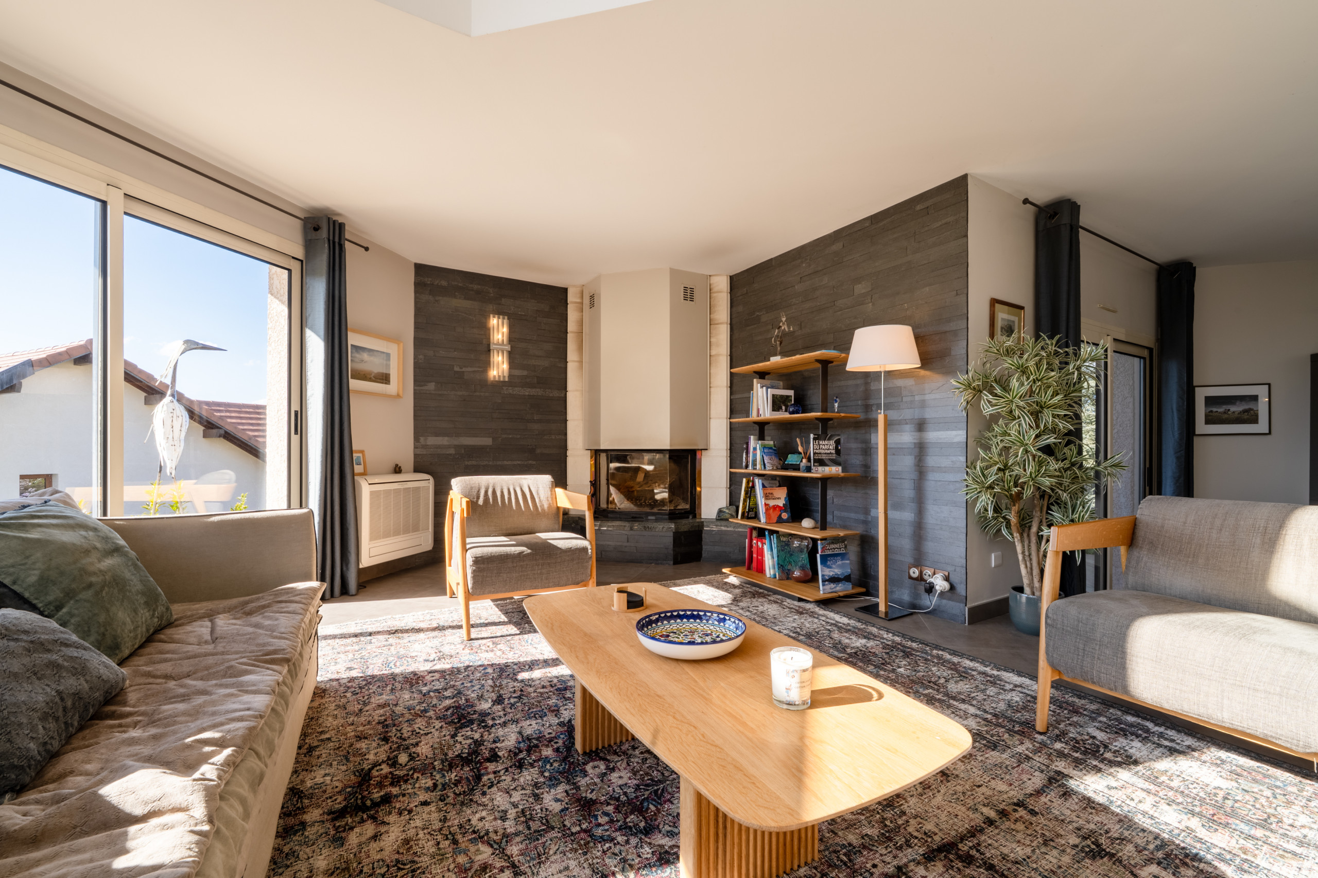 * Bright and spacious living room with fireplace, armchairs, sofas, and direct access to the terrace/garden