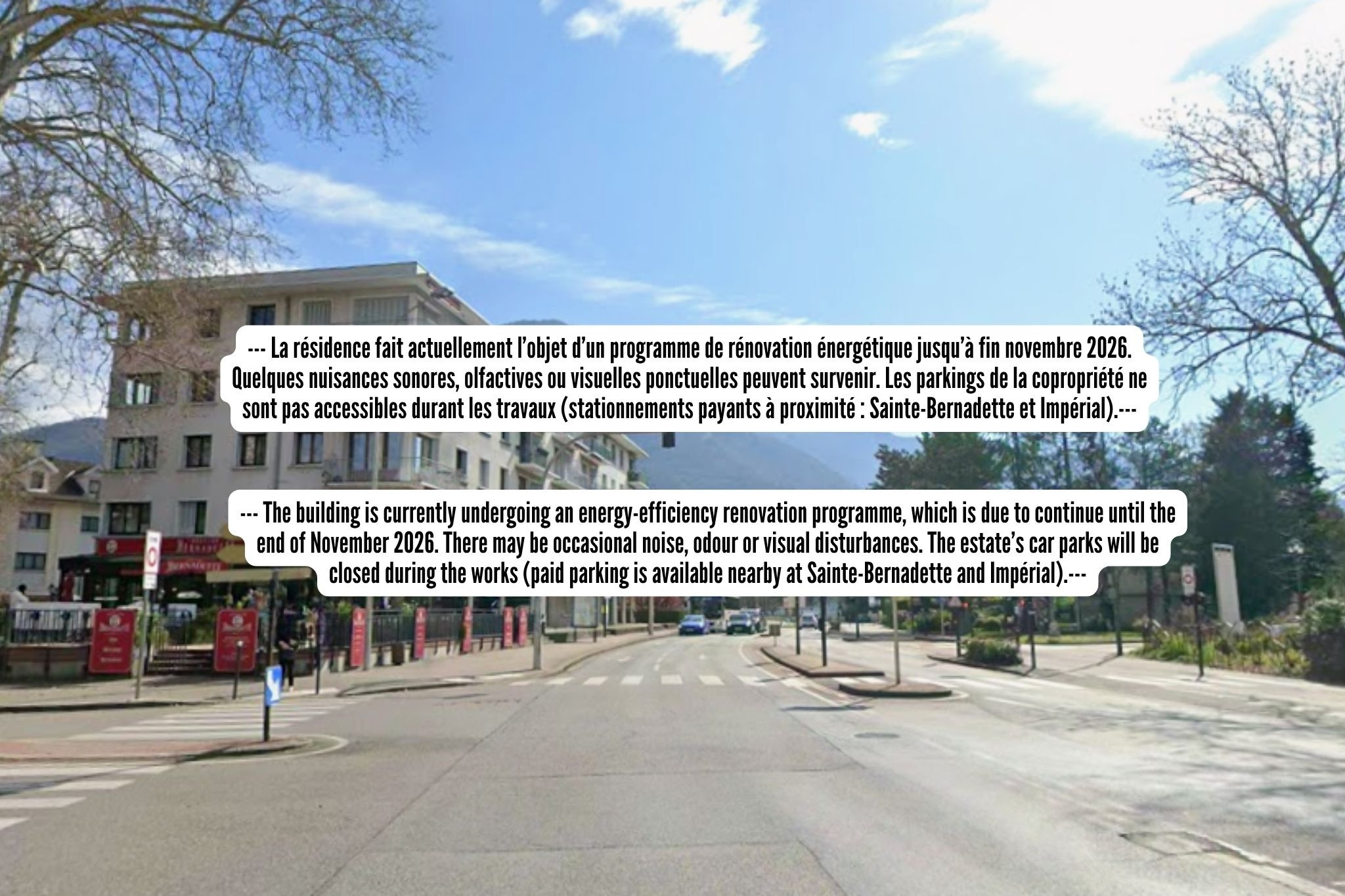 --- La résidence fait actuellement l’objet d’un programme de rénovation énergétique jusqu’à fin novembre 2026. Quelques nuisances sonores, olfactives ou visuelles ponctuelles peuvent survenir. Les parkings de la copropriété ne sont pas accessibles durant les travaux (stationnements payants à proximité : Sainte-Bernadette et Impérial).---