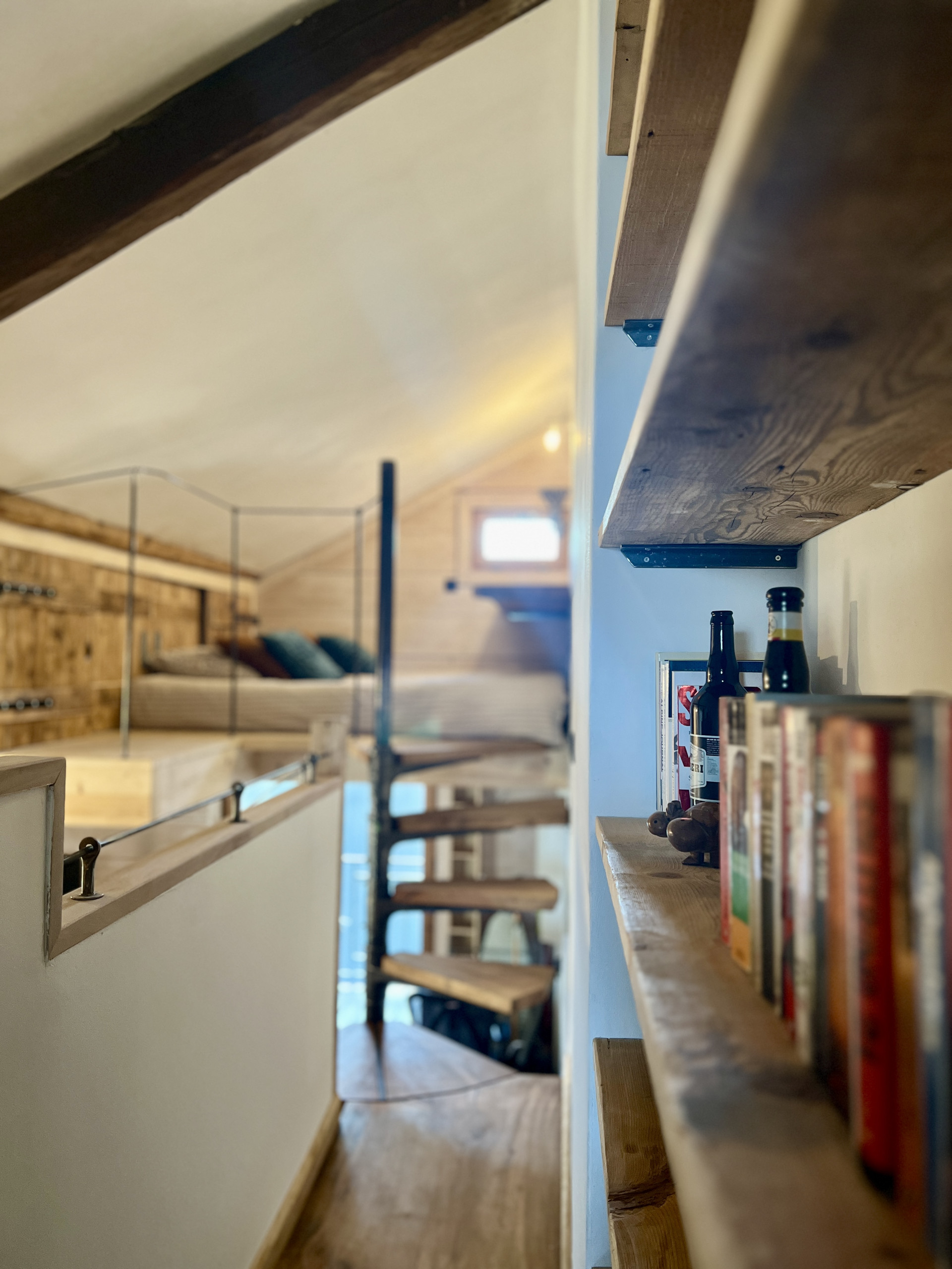 Un couchage supplémentaire pour deux personnes sur une mezzanine avec des matelas simples standard.