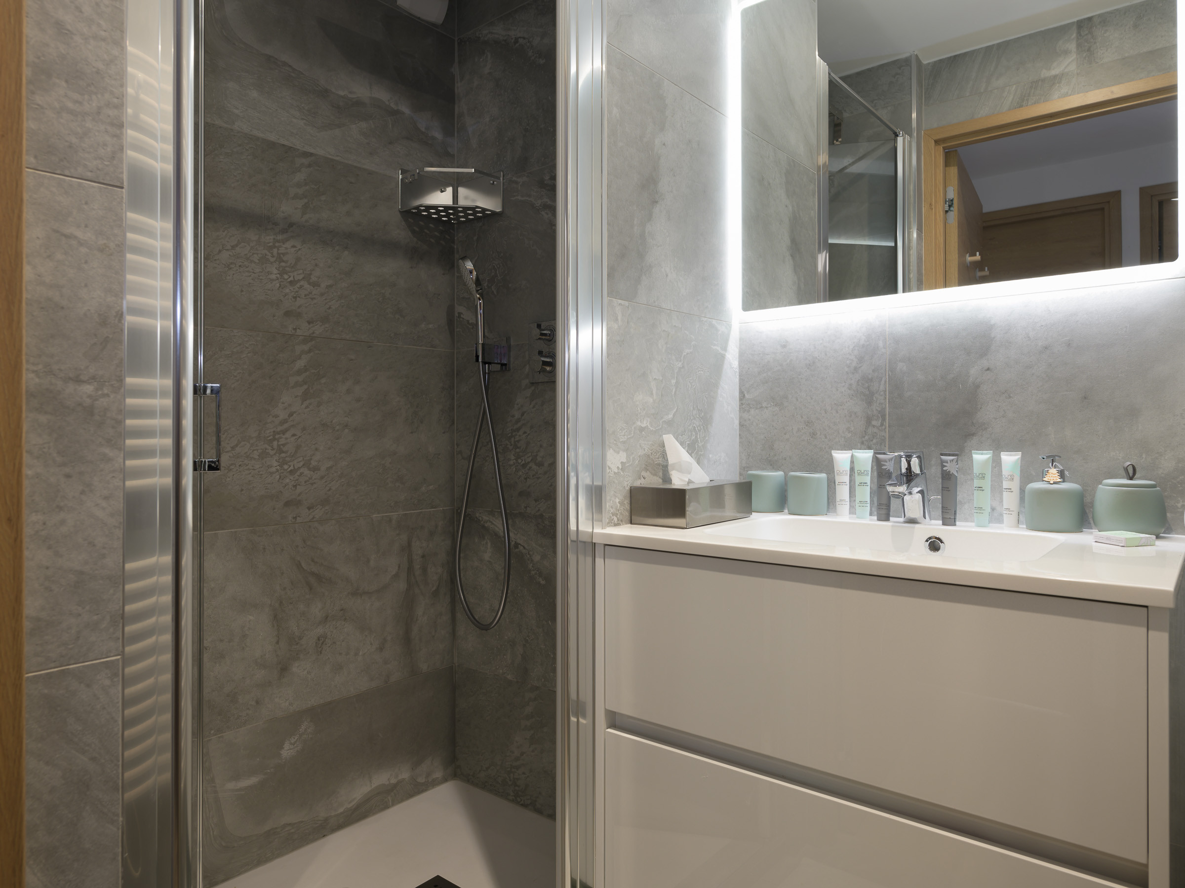 - Une salle de douche avec douche à l'italienne, sèche-cheveux mural, radiateur sèche-serviettes
