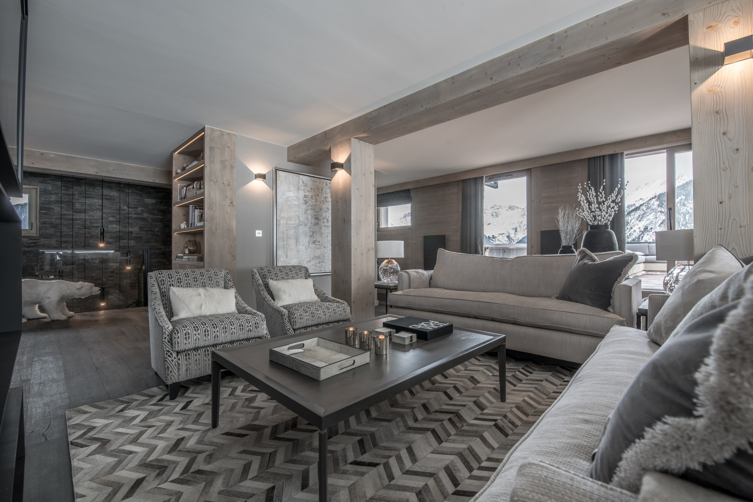 L'intérieur est décoré dans des tons neutres de gris et de taupe avec des tapis moelleux, des coussins en fourrure et des murs en bois et en pierre. Passez un moment confortable près de la cheminée avec vue sur les montagnes enneigées. Après une journée de ski, vous pouvez vous relaxer dans le sauna ou continuer de faire la fête sur la terrasse en profitant du salon extérieur et de la cheminée. Pour bien finir la journée, pourquoi ne pas vous offrir une coupe de champagne dans un des deux jacuzzis extérieurs chauffés tout en regardant les montagnes.
