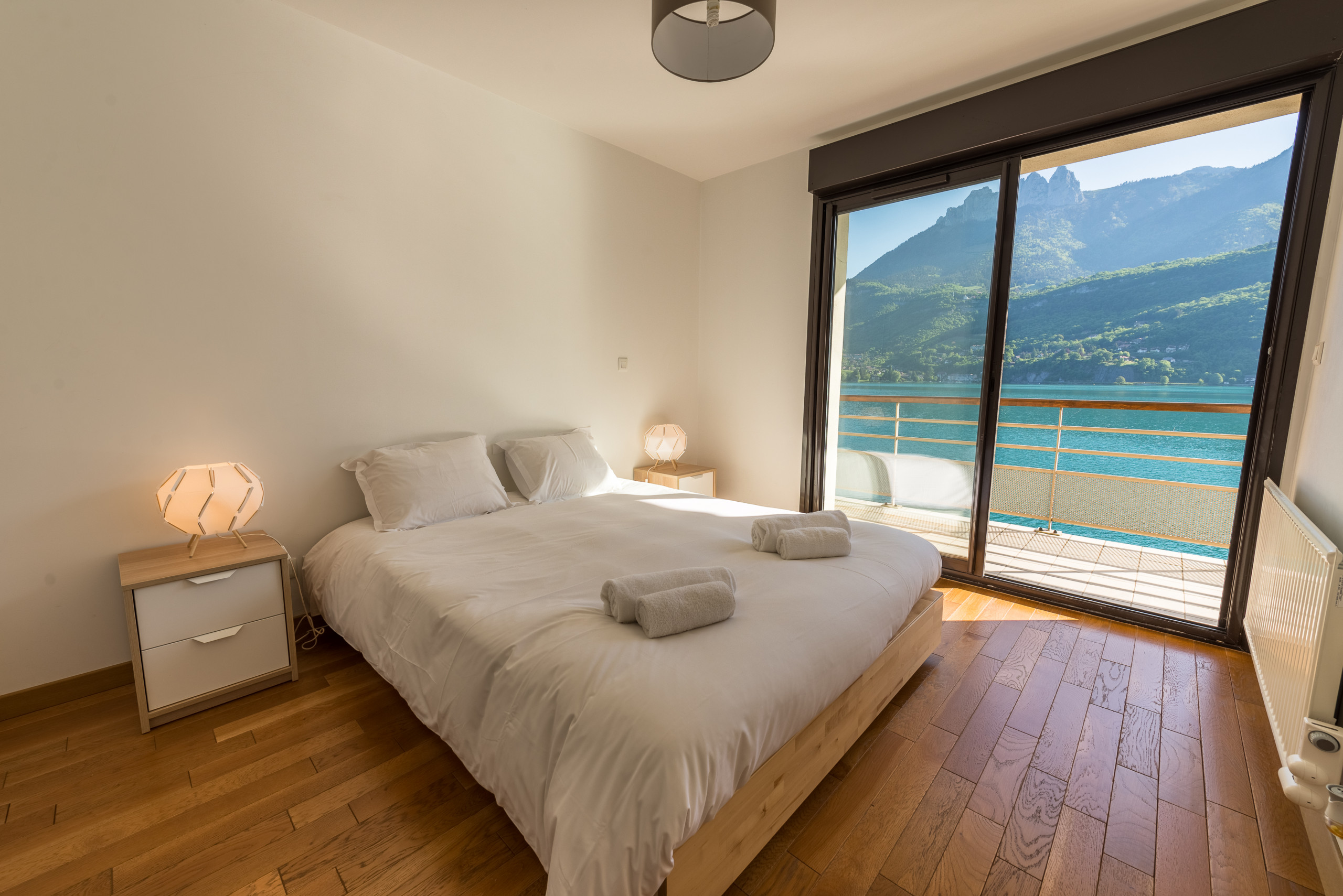 - Chambre n°1 : Chambre parentale avec accès direct au balcon et superbe vue lac. Lit 160x200cm avec sa salle de bain privative - baignoire et double vasque, WC privatifs.
