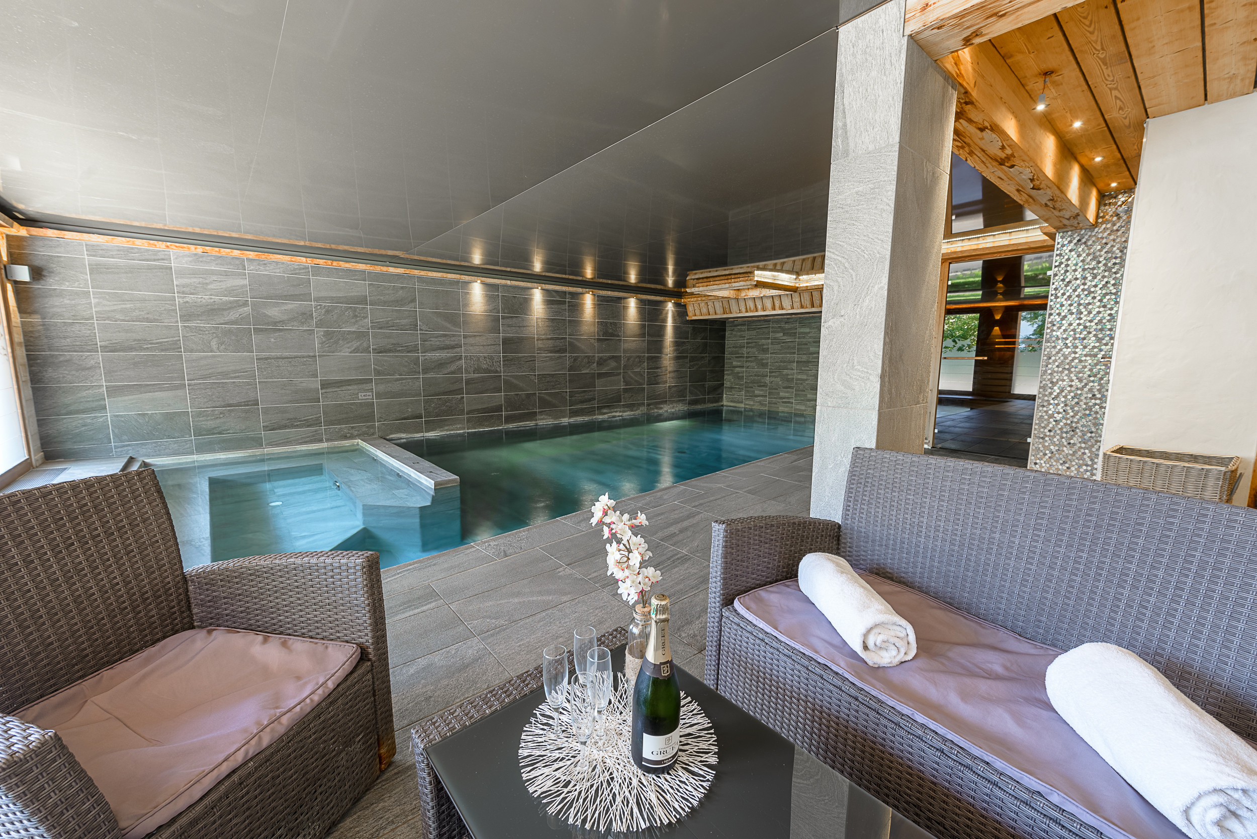 L’espace bien-être vous offre toute la journée et jusqu'en milieu de soirée, une baignade dans une eau à 29°, sous une charpente en bois massif et face à un paysage époustouflant et une splendide vue sur le clocher de l’église.
