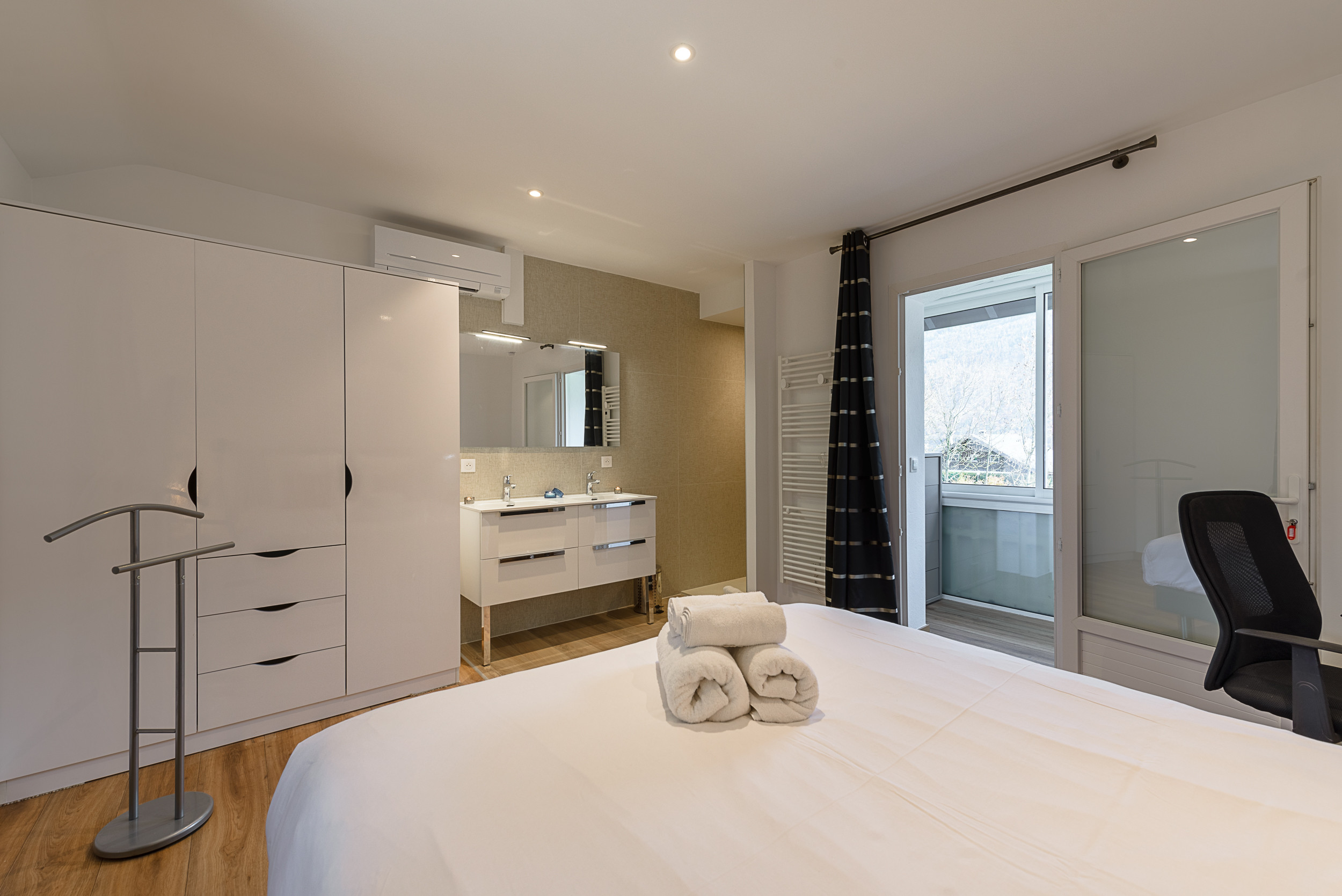 - Chambre n°3 (Orientée SUD, dos au lac, vue montagnes) : 2 lits simples de 80x200 twinables, une salle de douche et une TV, système SONOS, vue sur les montagnes