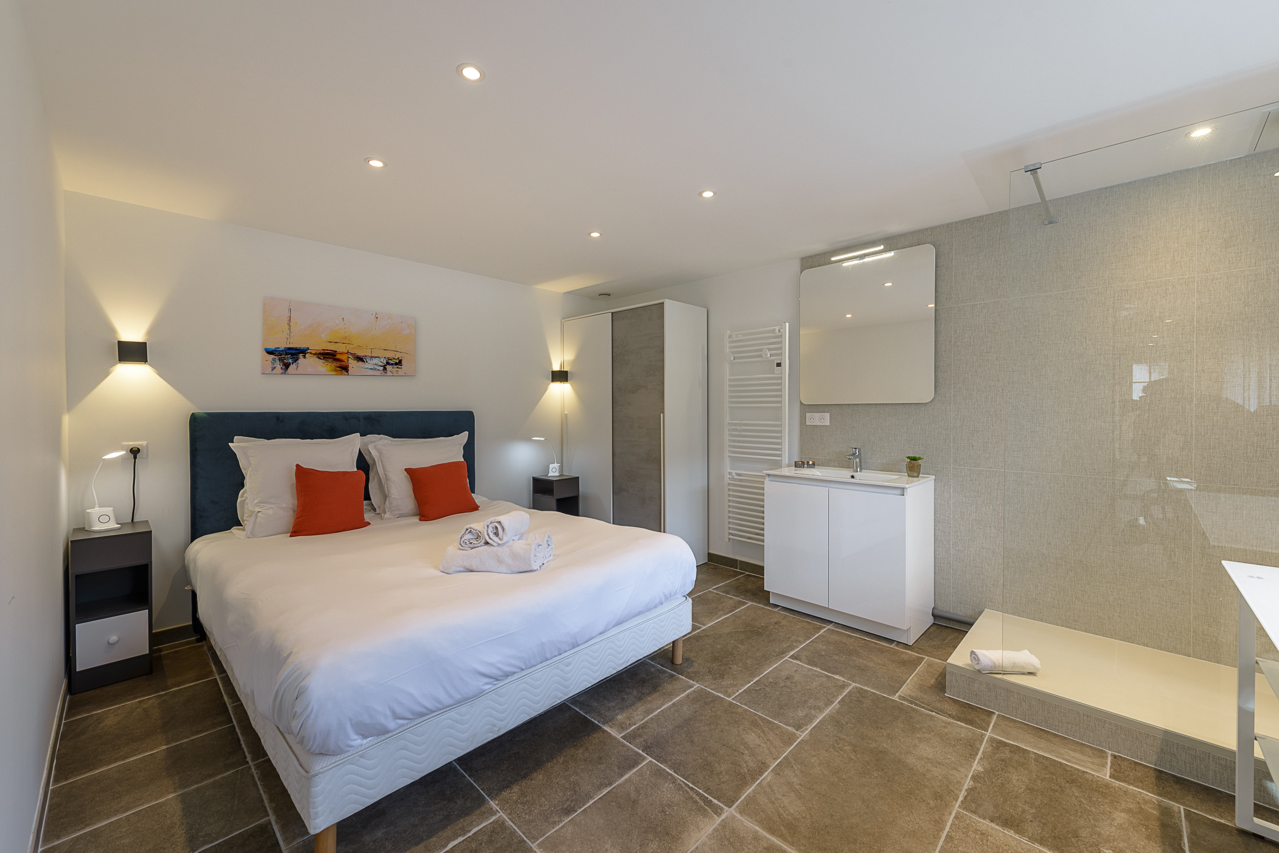 - Chambre 1 : lit queen-size (160x200) avec salle de douche attenante