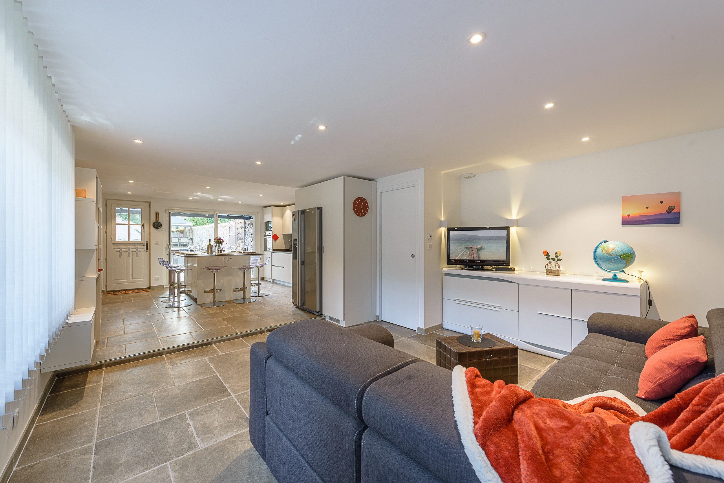 - Cuisine toute équipée ouverte sur la terrasse, la salle à manger et le salon