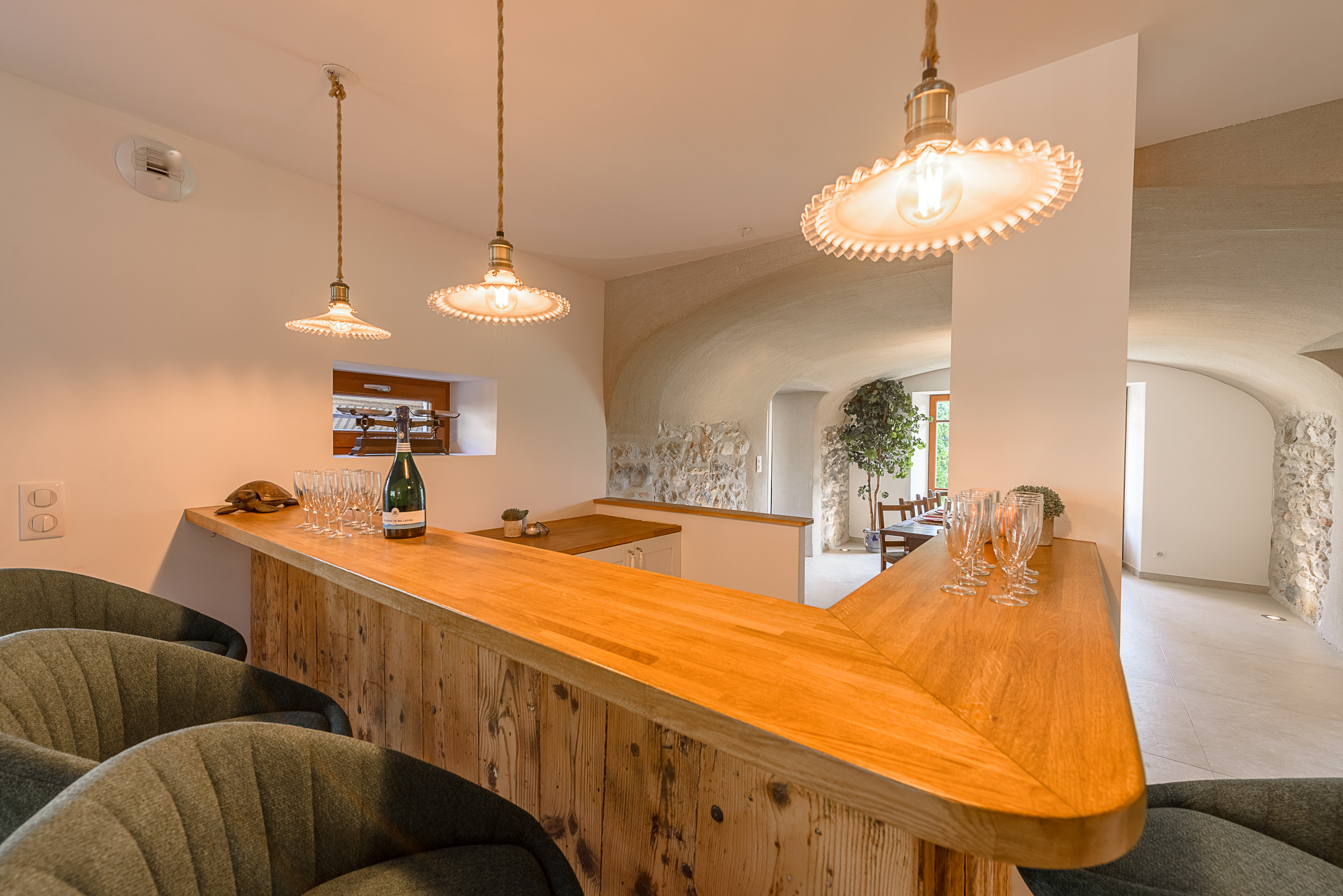 - L'espace bar, entre salon et salle à manger assurera de bons moments de convivialité