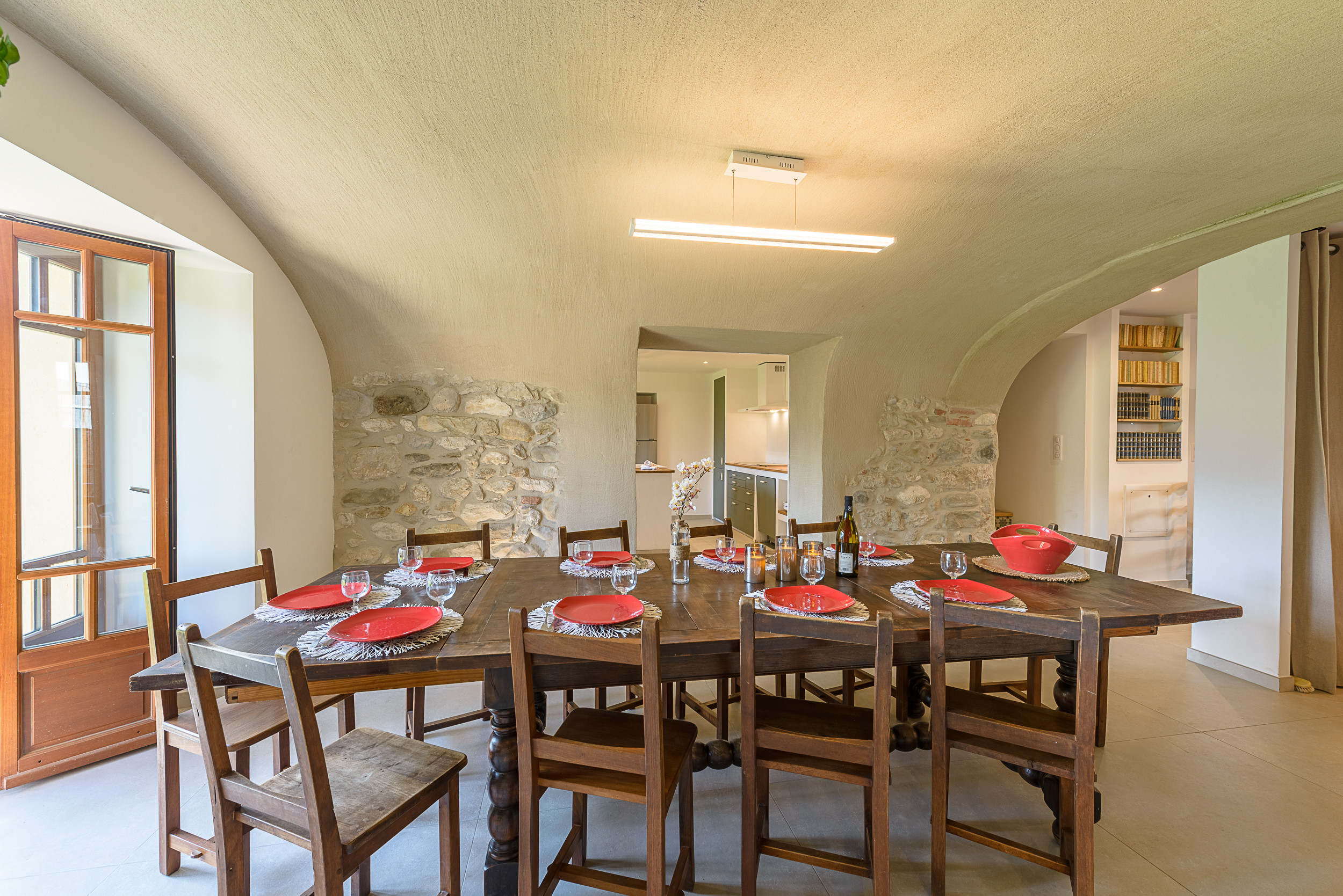 - Une salle à manger sous voute disposant d'une table à manger avec rallonge pouvant accueillir jusqu'à 16 personnes avec un accès au jardin