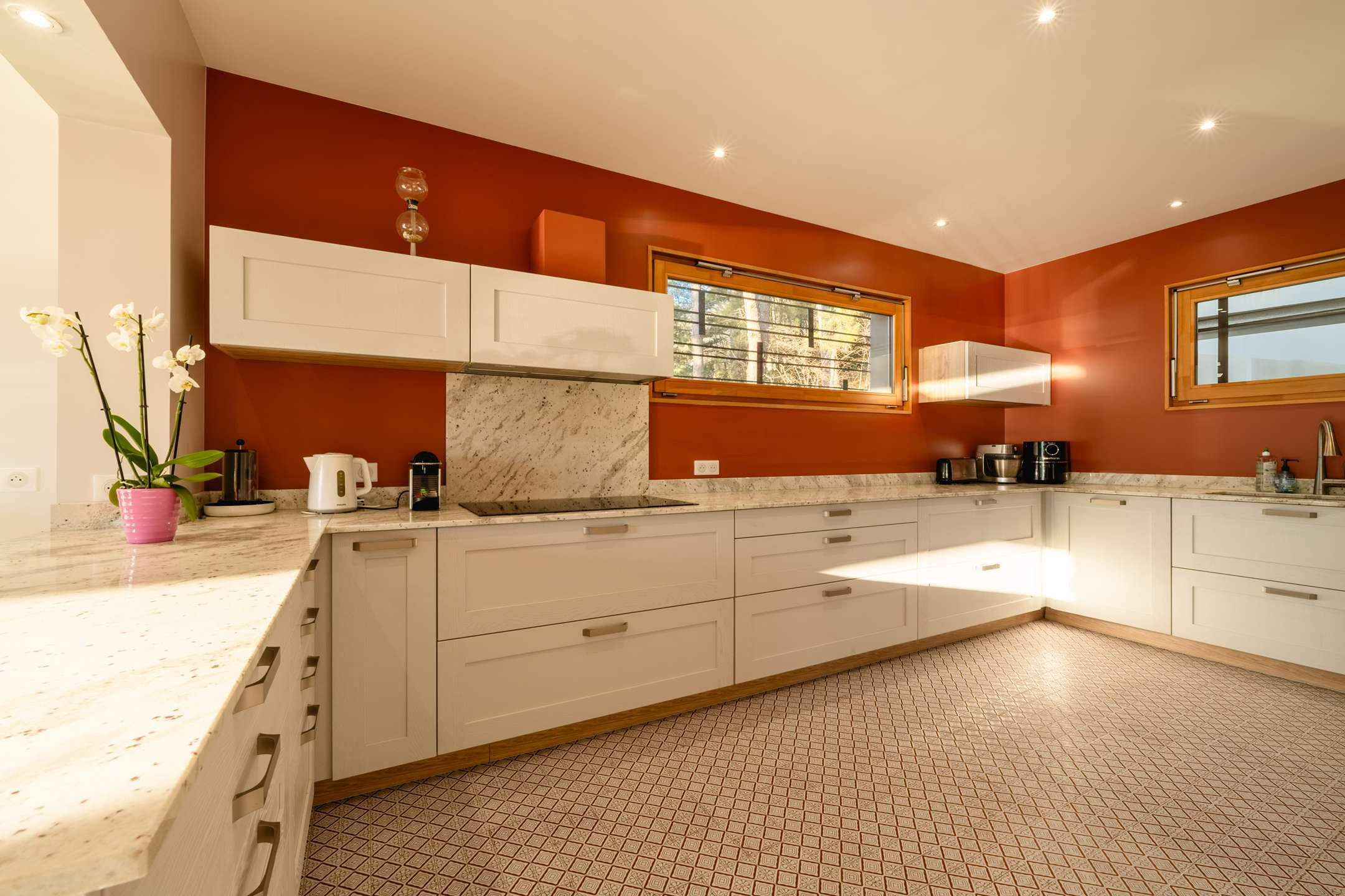 * Cuisine ouverte, moderne et entièrement équipée (réfrigérateur, lave-vaisselle, four…).