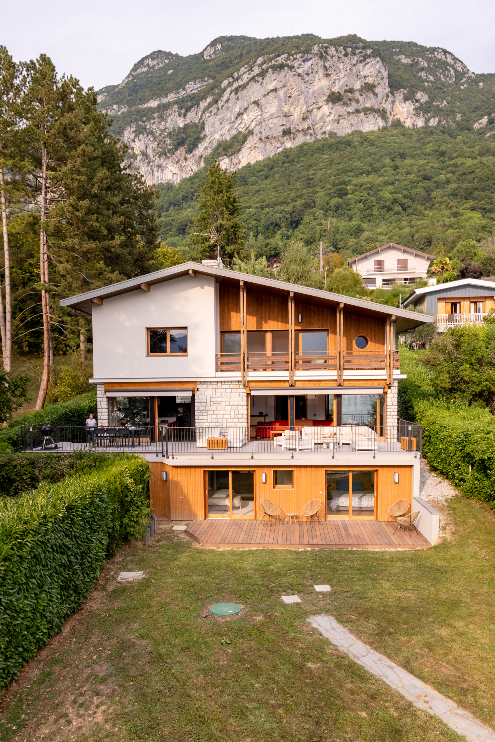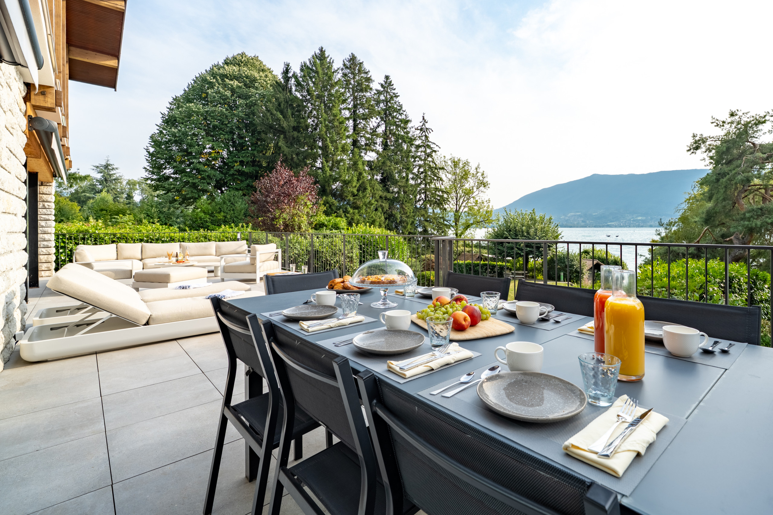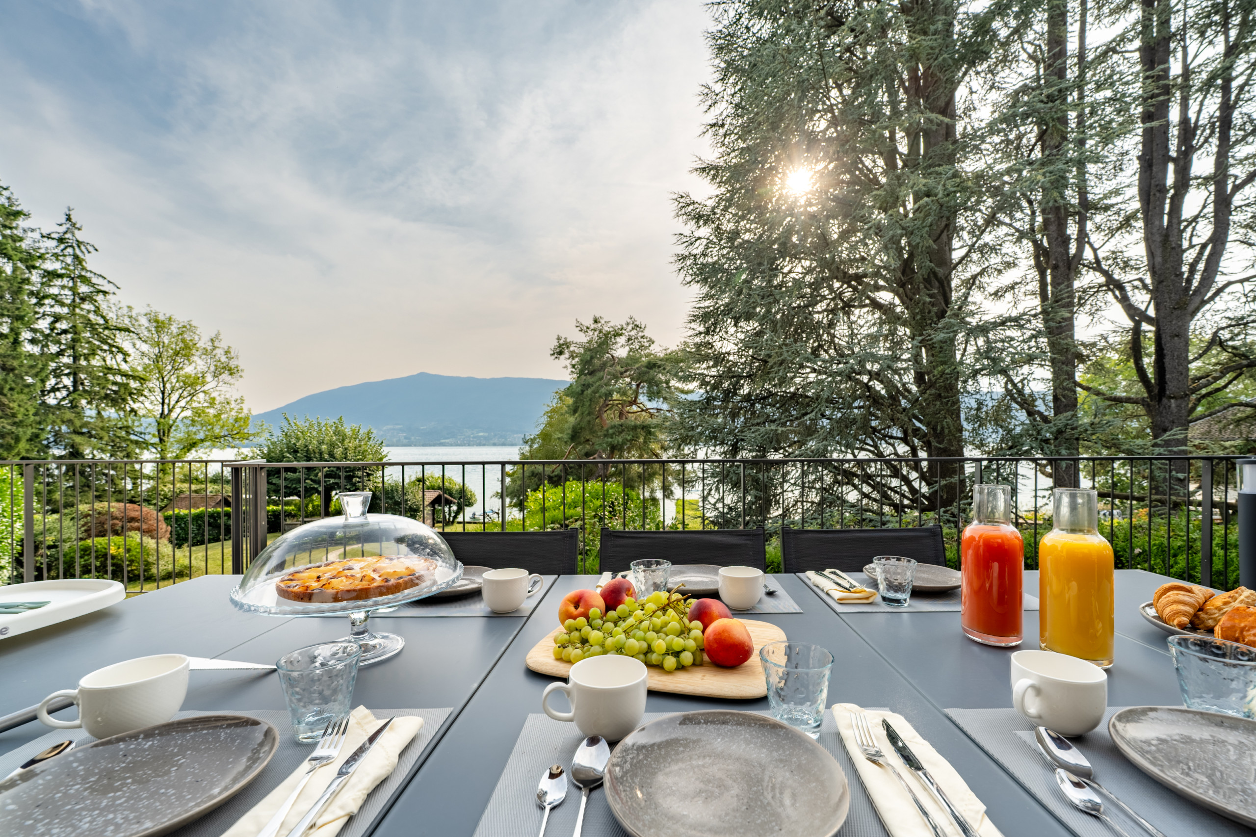 * Grand jardin privatif offrant une vue panoramique sur le lac et les montagnes.