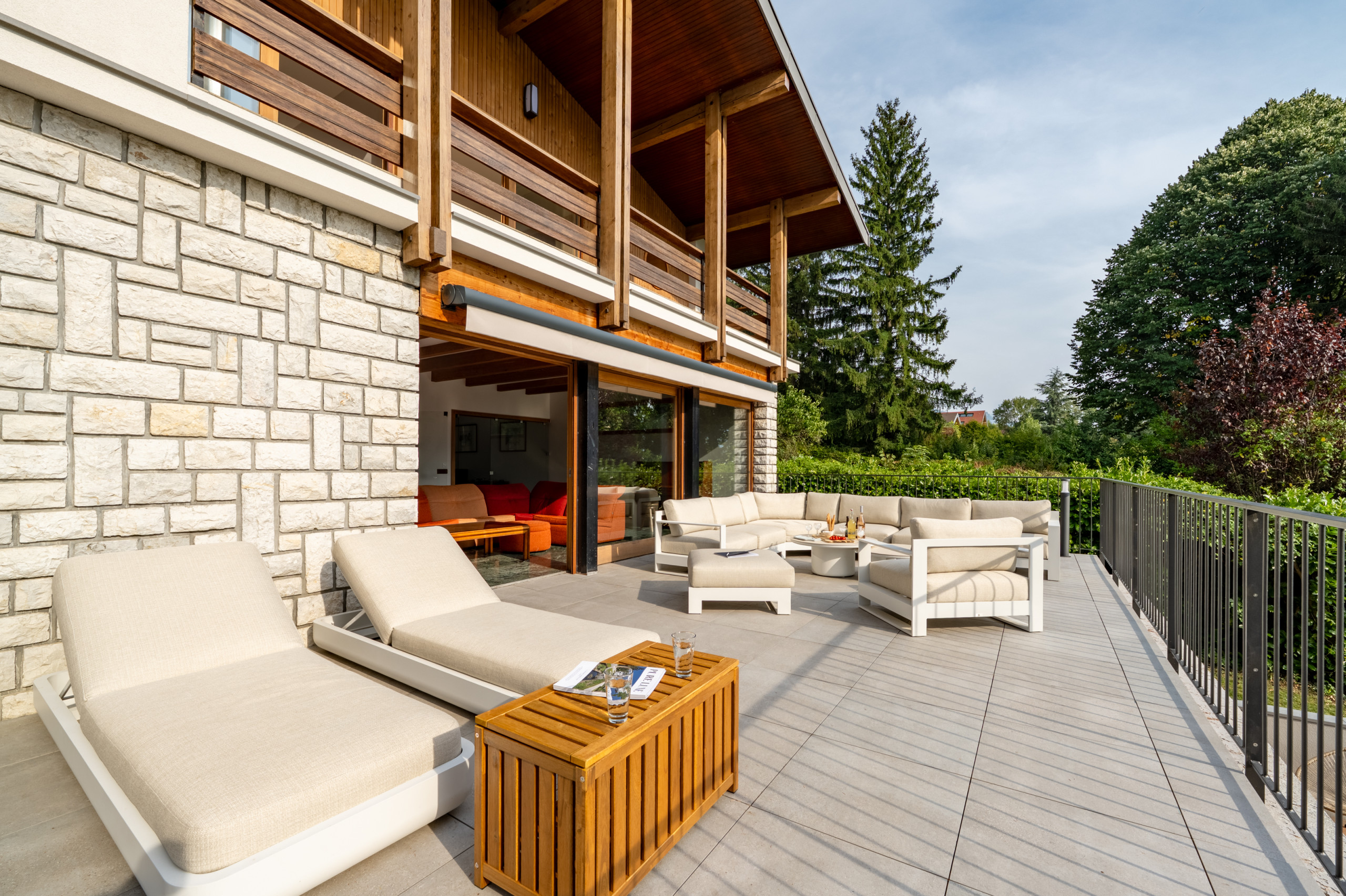 * Espace salon-salle à manger prolongé par une terrasse donnant sur l’extérieur, avec coin repas et barbecue.