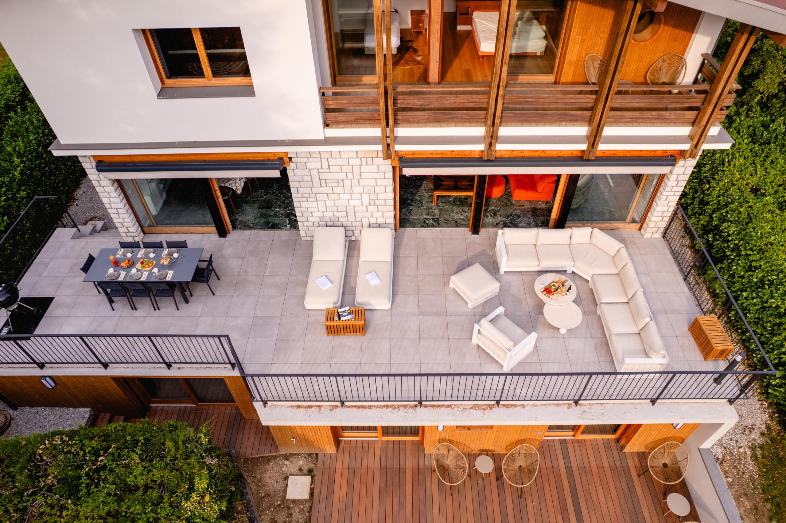 * Plusieurs terrasses aménagées : espace bronzage avec stores et canapés, coin repas extérieur avec barbecue, terrasse en bois devant les suites.